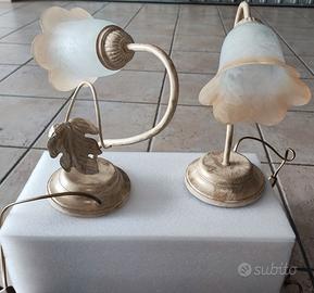 Coppia dilumetti in ferro battuto abatjourin stile "arte povera" shabby chic, caratterizzati da una struttura coloravorio sfumato oroe diffusori in vetro a forma di fiore (a "campana" o "calla"). Attacco lampadina E14 (attacco piccolo). Nuovi mai usati.