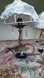 Coppia di abatjour in ferro battuto, con paralume rotondo foderato in cotone ricamato.