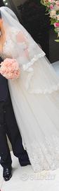 Abito da sposa mostrato è un modello principesco elegante e romantico (della collezione NICOLLE MILANO) pagato 5000€. Presenta un corpetto con profonda scollatura a V, interamente ricamato con pizzo floreale e dettagli di perline e applicazioni luminose che creano un effetto scintillante. Le sottili spalline aggiungono un tocco delicato. La gonna, ampia e vaporosa, è realizzata in tulle leggero e impreziosita lungo l’orlo da ricami in pizzo che richiamano il motivo del corpetto, creando armonia e continuità nel design. Il sottogonna glitterato ricoperto da rgsnzs con pizzo finale. Aggiunta di maniche e velo madonnale.