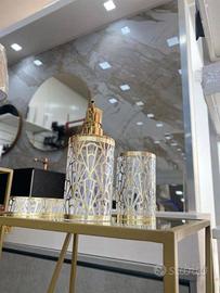 Accessori linea foglia oro Porta spazzolini:7.50 Porta sapone :5.50 Porta dispender:7.50 Per qualsiasi informazione Mostra numero - Mostra numero visita il nostro sito per scoprire tutti i nostri prodotti
