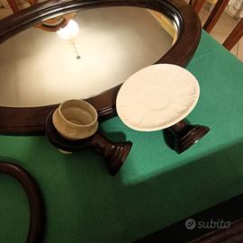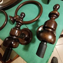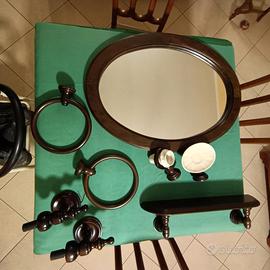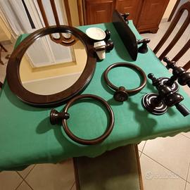 Accessori da bagno comprensivi di Specchio, mensola, punti luce, porta salviette, portasapone e portaspazzolini-dentifricio. Trattasi di un set coordinato in legno ideale per ambienti rustici tipo tavernette o ambienti di montagna (Baite, Bungalow ecc. ecc.)