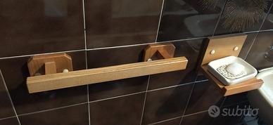 accessori bagno usati ma in ottimo stato,composti da : 2 porta asciugamani :uno cm 60, l' altro cm 40 1 porta salviette ospite 1 porta carta igienica 1 porta accappatoio in legno vendibili anche singolarmente
