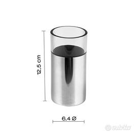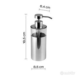 Set completo di dosasapone liquido, portaspazzolini, portasaponetta, scopino wc con ciuffo in setoli. Materiale: acciaio e resina trasparente escluso il portasaponetta che è in ottone cromato