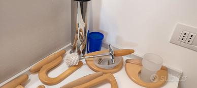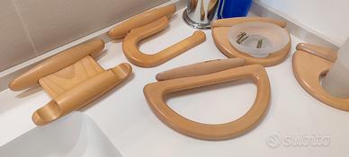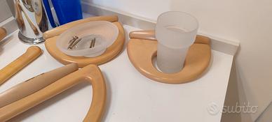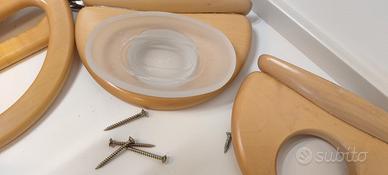 set di 6 pezzi accessori bagno in legno massello di acero porta salviette, porta accappatoio, supporto in legno per sapone e porta spazzolini completi di accessori in vetro satinato, scopino con spazzolino NUOVO, porta rotolo. gli accessori possono essere fissati al muro con viti o incollati con semplice silicone. usati ma in ottimo stato.