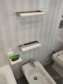 Accessori bagno marca INDA laccati bianco e cromo come da foto vendo anche separatamente per rifacimento bagno: 2 Pensili, 1 base, 3 mensole, 3 portasalviette, specchio 96x90cm e accessori vari. No spedizione.