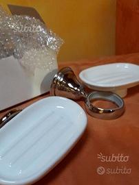 Vendo portasapone da lavabo e da vasca,in ceramica e acciaio mai montati,ancora nell'imballo originale,x cambio arredamento accessori a 15? al pezzo