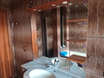 Vendo accessori per bagno, in buone condizioni come da foto, lavello incassato su mobile in legno con pianale in marmo e grande specchiera, sotto il lavabo ci sono 2 ante con 2 ripiani in vetro per asciugamani, wc completo di cassetta di scarico, bidet con rubinetteria comperata 2 anni fa, + colonna per doccia in acciaio.