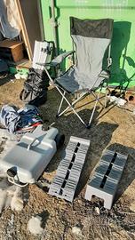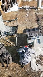 tavolo alluminio, cunei per camper,tanica scarico acque chiare e telo copribici su portabici camper.