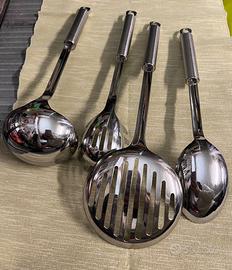 4 accessori cucina in acciaio inox Leifheit composti da mestolo, cucchiaio, schiumarola, cucchiaio spaghetti