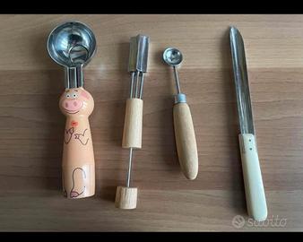 1 porzionatore da gelato 1 decoro torte 1 porzionatore piccole palline ( melone ecc) 1 cavatorsoli 1 gira crêpes 1 set insalata 1 paletta taglia formaggio 1 accessorio taglia formaggio 1 pinza 1 pinza a molla 1 imbuto per estrarre succo limone Prezzo cad. da 2 euro, acquisto minimo 3 pezzi Prezzo intero lotto di 11 pezzi euro 15