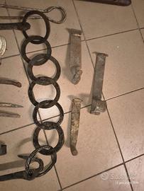 Scaldaletto, catena per caldaio da camino, gancio, interruttore in ceramica, mestoli per caldaio, pinze per legno camino ed altri accessori antichi.