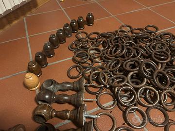 Accessori in legno per tende da interno..tutto il materiale in foto. Anelli,testate e reggi bastoni