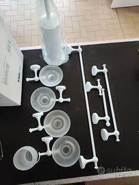 Set completo di porta asciugamani, porta sapone e spazzolino, scopino e appendini per bagno, nuovi in imballo originale. Prodotto di qualità, molto pesante, in ottone laccato bianco, idoneo per ambienti bagno.