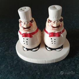 Cestino in vimini con posate in legno - Coppia calici grandi - Portaformaggio diamentro 28 cm - Set sale/pepe in porcellana a forma di simpati cuochi - Affetta patate con lame in acciaio inox - Servizio 12 bicchieri in vetro liscio - tutto in buone condizioni - a scelta a 4 euro la foto