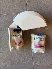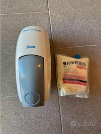 Set dispenser per bagno, composto da un dispenser automatico carta asciugamani (con fotocellula) funzionamento 220v Hygenius - Lucart, un dispenser sapone (pusch) Hygenius - Lucart con due ricariche di sapone neutro, un dispenser carta igenica interfogliata