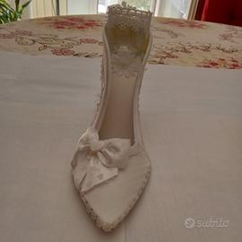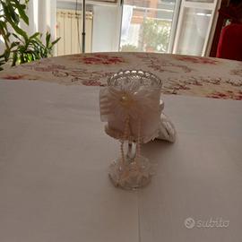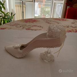 Vendo scarpina in tessuto interamente realizzata a mano ideale per il brindisi finale in un matrimonio visto che il tacco è costituito da un bicchierino. Perfetta anche per un' attività commerciale come elemento decorativo per una vetrina. Su Roma è da ritirare in loco e per fuori Roma sono da aggiungere le spese di spedizione