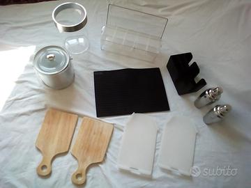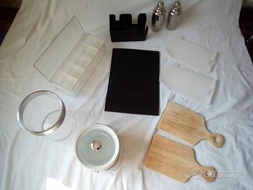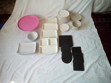 Materiale vario , composto da vari vassoi , piattini e piatti , tazze , porta ghiaccio , porta bottiglia , shaker , porta salviettine , sotto bicchieri gomma quadrettata , scatola con coperchio per agrumi , olive , ecc.....,