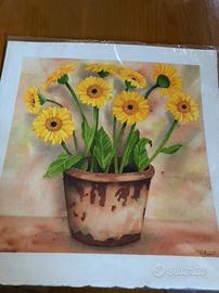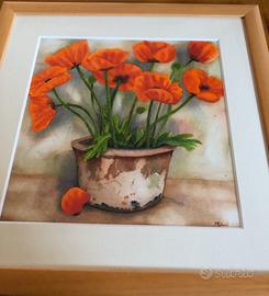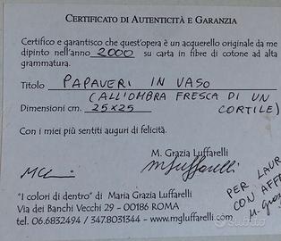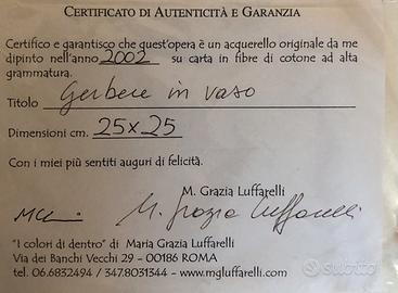 Vendo due meravigliosi acquarelli della pittrice romana Maria Grazia Luffarelli dal titolo Papaveri in vaso e Gerbere in vaso completi di certificato di autenticità. Dimensione 25x25 cm. Opere uniche di cui non esistono copie in stampa.