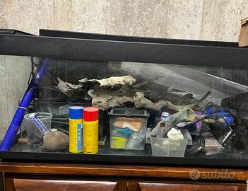 - Acquario 200 litri con coperchio (oppure pannelli trasparenti) 120 x 50 x 40. Usato, evidenti segni del tempo sul vetro, ma non compromesso + vari accessori (pompe, riscaldatori, aeratore, centralina e timer, tronchi ornamentali, sfondo nero, ghiaia)