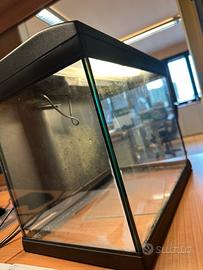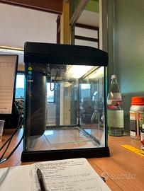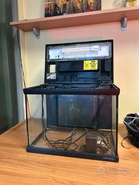 Acquario perfettamente funzionante, completo di luce e filtro. Regalo anche alcuni gadget utili come: retino, sifone per pulire la ghiaia, sfondo blu e un pò di lana di perlon.