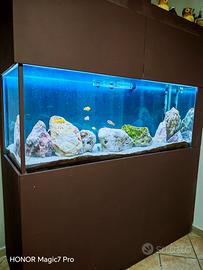 Come da titolo,acquario 550 litri circa.Le dimensioni della. vasca sono 160*55*65H in vetro extrachiaro da 12 mm.Vompleto di tavolo in ferro zincato con piedi regolabili per livellamento e pannelli per rivestimento come in foto.La vasca ha un filtro esterno tetra 1500 plus termostato e due tubi led e pesci del valore di oltre 100 euro.Regalo acquario di allevamento da 30 litri con 28 avannotti di mayalandi pulpican (ciclidi africani) . Possibilità scambio