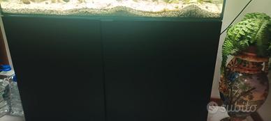 Acquario Lt 220 riccamente decorato con piante VERE,pietre ornamentali,oggetti decorativi(anfora,forziere,ponte)i;con più di 100 pesci TROPICALI colorati-varietà Guppy -doppio strato di ghiaia sul fondo-illuminazione a timer con doppio neon idonei ad acquari.Mobile sottostante nero a due ante richiudibili con ripiano interno, contenente motore per il filtraggio dell'acqua,termostato.