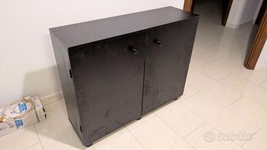 -ARTIGIANALE dotato di scheletro interno in acciaio saldato, e già fornito di mensola forata interna, a media altezza per il passaggio della cavetteria, presente anche barra LED 9w per illuminazione interna vano mobile. Doppia anta con chiusura a calamita.