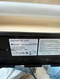 Acquario Cayman 60 Professional Led, nuovo e mai utilizzato. Vasca in vetro da 75 litri (spessore 5 mm), ideale sia per acqua dolce che marina, progettata secondo normativa EN60598-2-11 con dichiarazione CE. Il design moderno in colore nero, unito al coperchio incernierato e resistente all’umidità, lo rende pratico e sicuro: il coperchio è totalmente apribile e dotato di astina di supporto, con sportellino frontale per alimentare i pesci in modo semplice.