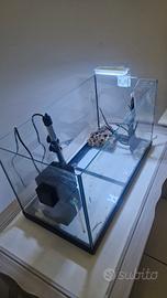 Vendo acquario in vetro completo di accessori: filtro interno con materiali filtranti (cannolicchi e spugne), riscaldatore 100W con termostato, termometro, pinza inox per la manutenzione, luce LED bianca/blu. Inclusi arredi naturali: legno e roccia forata. Ideale per allestimenti d’acqua dolce tropicale, pronto all’uso.