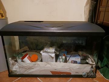 Acquario lunghezza 80 cm x altezza 47 cm profondità 32 cm completo di dosatore per mangime, poster nel lato posteriore, con sassolini sul fondo, completo di luci, con chiusura da sostituire.