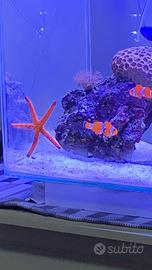 Acquario 28 litri 30x30x30 con tutti gli accessori mangiatoia automatica riscaldatore filtro schiumatoio ventola di movimento misuratore salinita’ retino rocce vive e un paguro blu