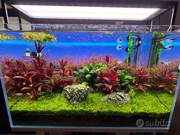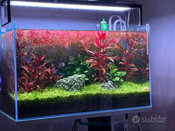 Vendo acquario Aqpet di 60 litri per una categoria più grande. Avviato da 1 anno e mezzo con tutto L’allestimento,pesci,filtro sicce, pannello retroilluminato dell’aqpet, lampada della wrgb 2 slim chiricos, erogatori dell’Ada. Mobile in regalo è poco rovinato.