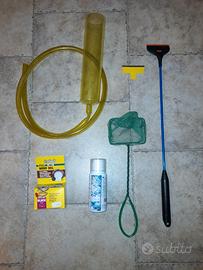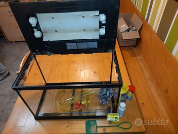 Acquario 75 litri ,senza filtro,coperchio serve solo per chiudere quindi senza i dispositivi elettrici, un piccolo striscio sul vetro. Come acessori paletta per pulire il vetro,retina per prendere i pesci,tubo per sfondare il fondi e liquido anti alga. La base è 62cm per 34 cm e alto 45cm.