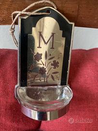 Acquasantiera da parete in metallo, con inserto decorativo centrale e simbolo mariano “M”.