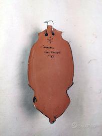 Piccola acquasantiera, altezza 18 centimetri decorata e dipinta a mano proveniente da Grottaglie, paese famoso da sempre per la produzione di ceramiche d'arte