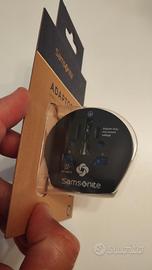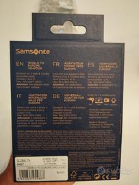 Adattatore Samsonite per utilizzare elettrodomestici con tutti i tipi di spina del mondo nella rete europea con prese schuko (anche dette "tedesche").