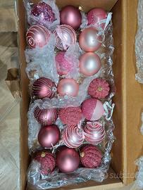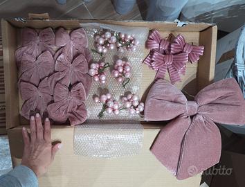 Vendo addobbi per albero di natale, colore Rosa.completi di punteruolo e tappeto gonna in velluto rosa per coprire i piedi albero. Palline sia vetro che plastica. Tutto come in foto. Prezzo non trattabile