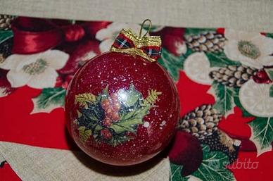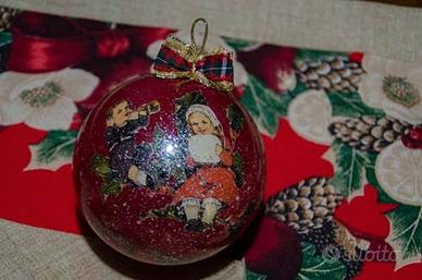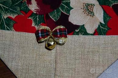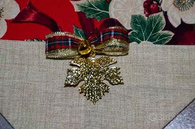 Set di 2 runner in cotone doppio tessuto, fantasia natalizia e fondo unico beige, cuciti e decorati a mano. I ranner sono stati abbelliti con accessori natalizi, fiocchetti, campanelli e foglie oro per dare luce alla tavola. La pallina per decorare l'albero di natale si abbina ai runner in plexiglass lavorata a mano con tecnica decoupage. Ottima idea regalo, personale, per parenti amici e quant'altro.