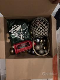 - Vari addobbi misti, tra cui sagome natalizie e un contenitore decorativo intrecciato.