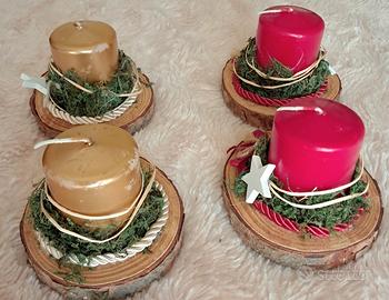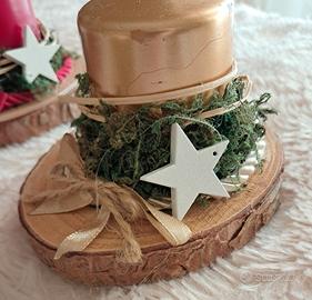 Centro tavola su base in vero legno. candela rossa o dorata. € 4 cadauno. le xsndeke dorata presentano piccole schiattare di colore , si effettua uno sconto.