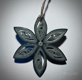 Fiore di Natale realizzato a mano con la tecnica del quilling, utilizzando fasce di carta di diversi colori e arricchite con glitter argentato. Perfetto come addobbo per l’albero, decorazione casalinga o da abbinare a biglietti e bomboniere natalizie.