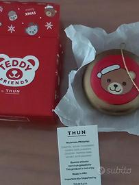 vendo addobbo per albero di Natale rotondo con nastro color oro, con immagine orsetto di Natale, nuovo con cartellino Thun