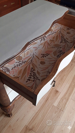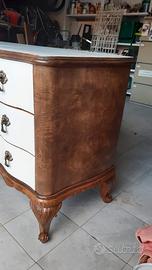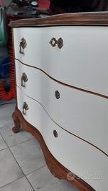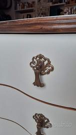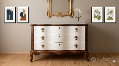 Aggiungi un tocco di eleganza e personalità al tuo arredamento con questa splendida cassettiera artigianale, finemente restaurata e reinventata per uno stile unico. Dettagli che la rendono speciale: • Restyling Esterno: Frontali dei cassetti riverniciati in bianco caldo per illuminare l'ambiente, in perfetto contrasto con le spallette impellicciate in Radica e i piedi a ricciolo mantenuti in legno originale per preservarne l'anima antica. • Dettagli di Pregio: Maniglie e bocchette originali in ottone lavorato. • Interni Sorprendenti: Cassetti interamente rivestiti con carta decorativa a motivi vegetali stilizzati, per un tocco di stile anche all'apertura. • Versatilità: Grazie alle sue linee sinuose, è un pezzo unico perfetto non solo per la camera da letto, ma anche come mobile d'ingresso o pezzo d'accento in una zona living moderna. Dimensioni: Larghezza max al centro cm 57 – Min ai lati cm 52 Lunghezza cm 145 Altezza cm 91 Condizioni: Ottime, pronta per arredare la tua casa. NON PERDERE L'OCCASIONE DI POSSEDERE UN PEZZO UNICO E SPECIALE PER LA TUA CASA O IL TUO UFFICIO! RITIRO SOLO A MANO