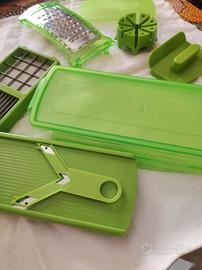 sminuzza, grattugia, affettati ogni tipo di verdura composto da contenitore con base multifunzione contenitore con coperchio ermetico e otto utensili
