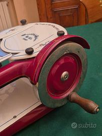 Affettatrice con lama orizzontale in ghisa e piatti in ceramica dipinta. Lama diametro cm 22. Misura h cm 23....lunghezza cm 40...larghezza cm 40 compresa la manopola in legno del volano. Come da foto, la cromatura del volano è da restaurare. Il piatto inferiore presenta delle piccole imperfezioni. Ritiro a domicilio per il peso rilevante