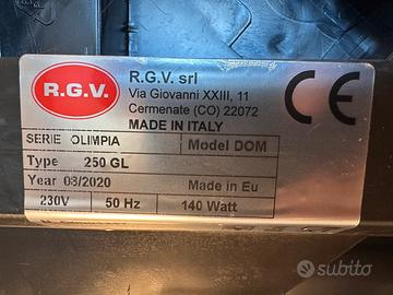 Affettatrice R.G.V. Made in Italy, modello Olimpia Dom 250 GL, praticamente nuova. Utilizzata 4-5 volte e sempre pulita e riposta in maniera maniacale. A corredo istruzioni oroginali e sacca di protezione in tessuto.