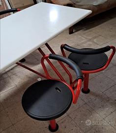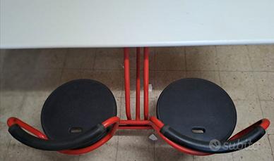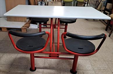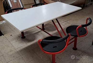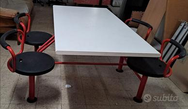 AIRON TAVOLO MENSA O LAVORI IN GRUPPO A 4 POSTI GIREVOLI - DIMENSIONI PIANO CM L140XP75XH75 - INGOMBRO TOTALE CM 170X140XH75 - PIANO IN BILAMINATO ANTIGRAFFIO BIANCO - STRUTTURA ROBUSTA IN METALLO COLORE ROSSO - SEDUTE GIREVOLI CON SPALLIERA IN METALLO E SEDUTA RIVESTITA IN GOMMA NERA - MODERNARIATO ANNI 90 - UNICO - OCCASIONE - INTROVABILE - TRASPORTO E RITIRO A VS CARICO DA CONCORDARE -