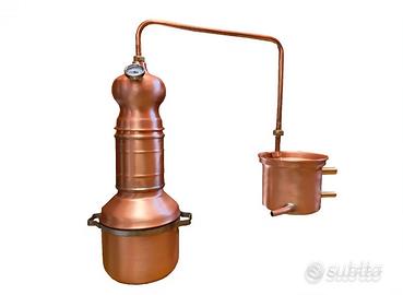 ALTEZZA TOTALE 57 CM CIRCA LUNGHEZZA TOTALE 56 CM CIRCA ALAMBICCO CON CAPACITA' 3 Lt- MODELLO SERPENTINA A COLONNA PER DISTILLAZIONI IN CORRENTE DI VAPORE E PER DISTILLAZIONE IN IMMERSIONE. L'ALAMBICCO E' TUTTO IN RAME CON FILTRI INTERNI E PAGLIETTA SEMPRE IN RAME QUESTO ALAMBICCO E' ADOPERABILE PER QUALSIASI TIPO DI DISTILLAZIONE, OLI ESSENZIALI O DISTILLAZIONI DI AROMI,ESSENZE o DI PROFUMI O DI ALCOOL , Diverse modalità d'uso: LA DISTILLAZIONE IN CORRENTE DI VAPORE VA FATTA RIEMPENDO LA CALDAIA DI ACQUA E LA COLONNA DI ERBE ,PIANTE ECC. IN QUESTO MODO OTTERRETE LA DISTILLAZIONE IN CORRENTE DI VAPORE LA DISTILLAZIONE IN IMMERSIONE VA FATTA RIEMPIENDO LA CALDAIA CON ACQUA E PIANTE E IN QUESTO CASO LA COLONNA FUNGERA' DA FILTRO , RAFFREDDANDO DIRETTAMENTE PARTE DEI VAPORI + PESANTI NELLA COLONNA . QUESTO ALAMBICCO E DOTATO DI TUTTI GLI OPTIONAL PER LA DISTILLAZIONE: TERMOMETRO, COLONNA con FILTRO La distillazione a vapore (o a corrente di vapore) è una tecnica impiegata per distillare alcol o oli essenziali da elementi organici mediante un flusso di aria calda generata da un bollitore che li attraversa. Il sistema è facilmente controllabile,ed è il piu adatto per ottenere prodotti di qualità. Gli elementi organici (erbe,radici,bacche,frutti ecc.) sono inseriti nell'apposita camera colonna,freschi o essiccati, e il vapore pressurizzato è generato in un contenitore separato. Il flusso caldo è usato per separare gli oli essenziali dalla miscela organica, e in alcuni casi aromatizzando le molecole alcoliche della soluzione iniziale. Elementi particolarmente sensibili che si degradano nella distillazione semplice,possono essere estratti a temperature basse,tramite questo metodo. In sostanza il procedimento è simile a quello della distillazione semplice,differendo solo per il flusso di vapore che attraversa la mistura. -