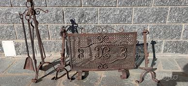 Atrezzatura completa per camino in ferro battuto, coppia di alari in forma di draghi, parascintille e atrezzi di servizio al camino antichi, gli alari sono molto consumati nel piede.