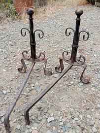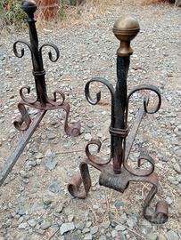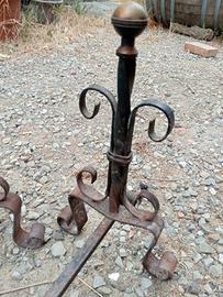2 alari per camino in ferro intarsiato con pomello. 40 cm altezza.